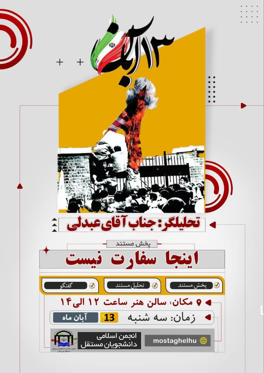انجمن اسلامی دانشجویان مستقل دانشگاه هرمزگان به مناسبت ۱۳ آبان، مستند «اینجا سفارت نیست» را با حضور و کارشناسی آقای عبدلی روز سه‌شنبه ۱۳ آبان ۱۴۰۴ از ساعت ۱۲ تا ۱۴ در تالار هنر اکران می‌کند. این برنامه با هدف بازخوانی رویدادهای تاریخی و تقویت نگاه تحلیلی دانشجویان برگزار می‌شود.