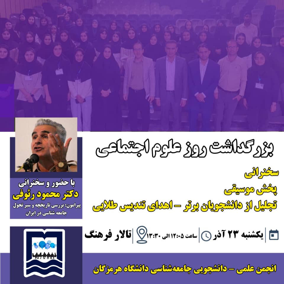 انجمن علمی دانشجویی جامعه‌شناسی دانشگاه هرمزگان، به مناسبت گرامیداشت روز علوم اجتماعی، مراسمی ویژه و پربار را برگزار می‌کند. این رویداد فرصتی ارزشمند برای تأمل در تاریخچه و تحولات جامعه‌شناسی در ایران فراهم می‌آورد و با برنامه‌های متنوع، دانشجویان و علاقه‌مندان را به جشن این رشته مهم دعوت می‌نماید.
