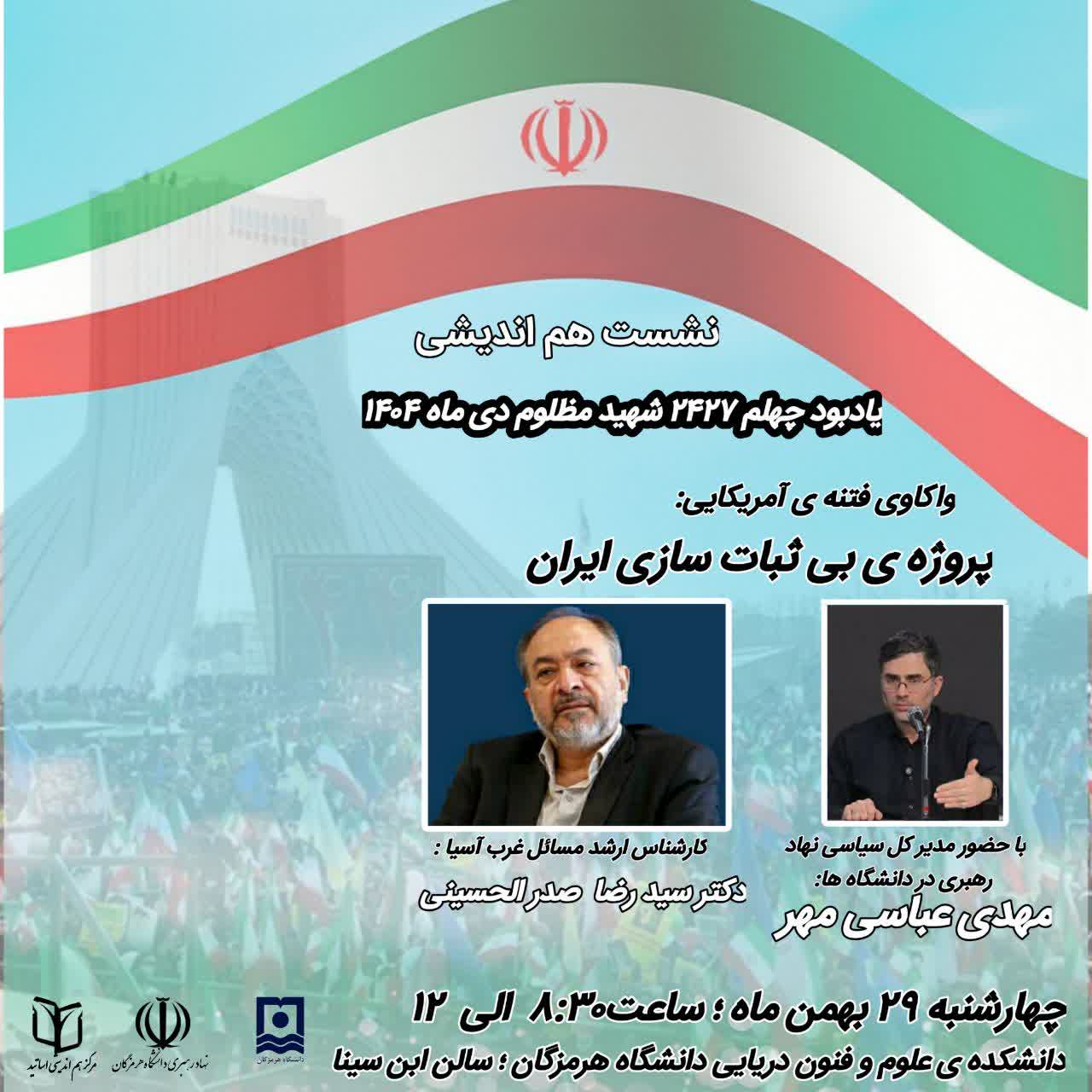 همزمان با چهلم ۲۴۲۷ شهید مظلوم دی‌ماه، نشست تخصصی با عنوان «واکاوی فتنه آمریکایی؛ پروژه بی‌ثبات‌سازی ایران» ویژه اساتید و اعضای هیئت علمی در دانشگاه هرمزگان برگزار می‌شود.